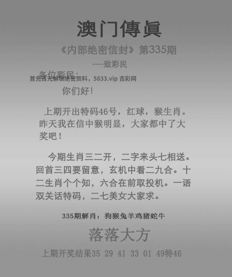 | 335期⑨肖【虎蛇狗鼠兔羊猪猴龙】开:狗44准 |