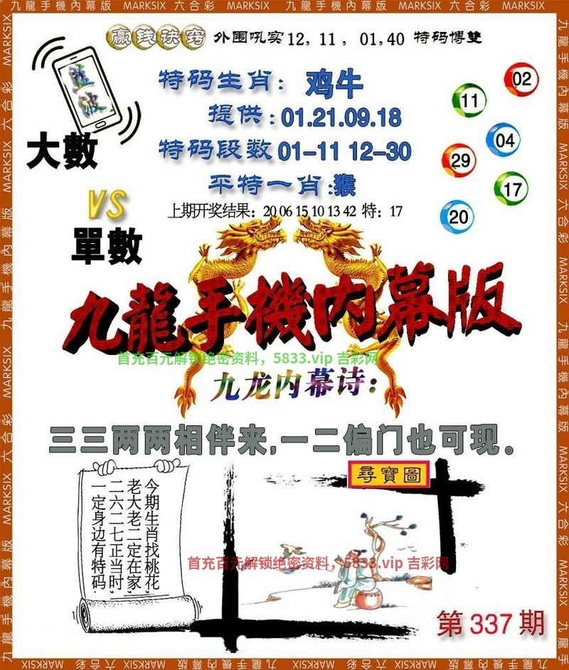 337期正版诗象(开鸡09) 三三两两相伴来,一二偏门也可现 推荐肖:鸡牛蛇猪羊 |